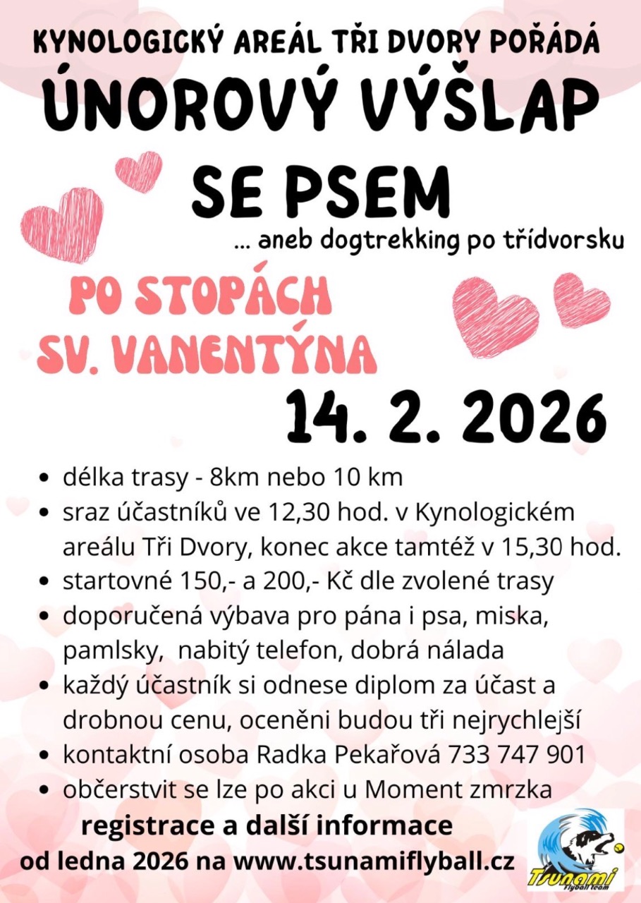 16.12.2025 19:31Zveme všechny pejskaře a milovníky společných procházek na pohodový únorový výšlap se psem, který pořádá Kynologický areál Tři Dvory. Čeká vás příjemná trasa krásným okolím, čas strávený se svým čtyřnohým parťákem a valentýnská atmosféra.